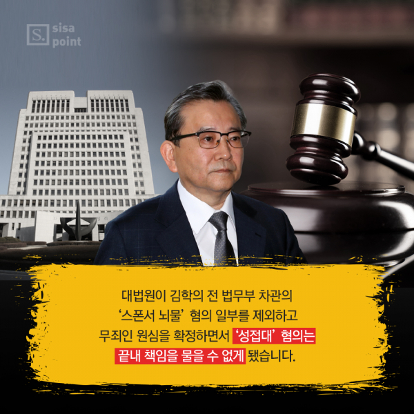 1. 대법원이 김학의 전 법무부 차관의 ‘스폰서 뇌물’ 혐의 일부를 제외하고 무죄인 원심을 확정하면서 ‘성접대’ 혐의는 끝내 책임을 물을 수 없게 됐습니다.