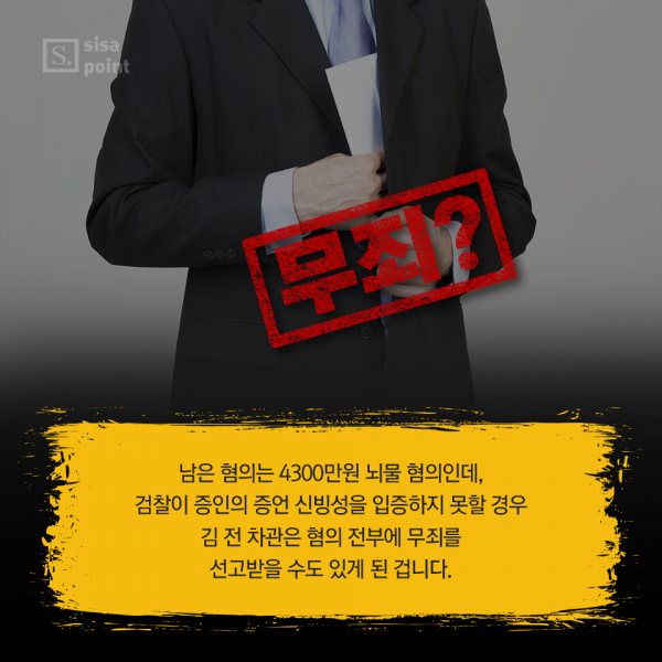 2. 남은 혐의는 4300만원 뇌물 혐의인데, 검찰이 증인의 증언 신빙성을 입증하지 못할 경우 김 전 차관은 혐의 전부에 무죄를 선고받을 수도 있게 된 겁니다.