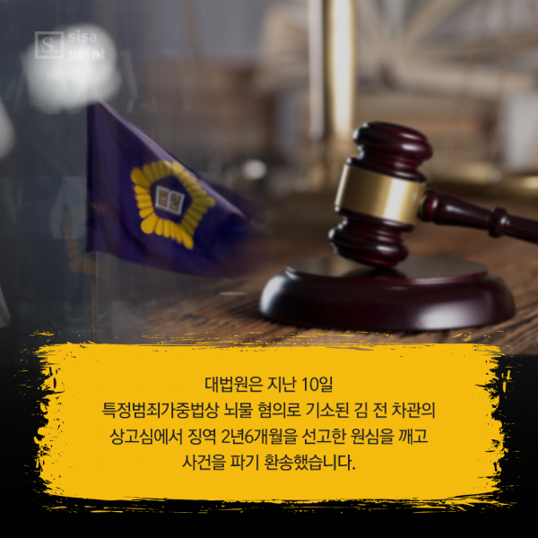 3. 대법원은 지난 10일 특정범죄가중법상 뇌물 혐의로 기소된 김 전 차관의 상고심에서 징역 2년6개월을 선고한 원심을 깨고 사건을 파기 환송했습니다.