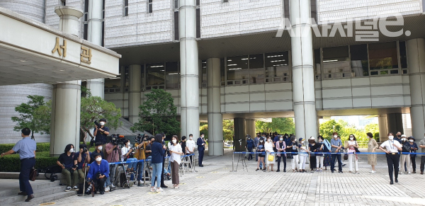 입구 앞에는 사람들의 출입을 제한하기 위해 벨트형 차단봉이 설치됐다. 취재진은 ENG 카메라 촬영 준비를 했고, 10여명의 유튜버들은 조 전 장관을 옹호하거나 성토하는 라이브 방송을 진행하고 있었다. 법원 직원들과 다수의 경찰 인력은 건물 안으로 출입하는 시민들의 동선을 관리하면서 차단봉 주위를 지키고 섰다.