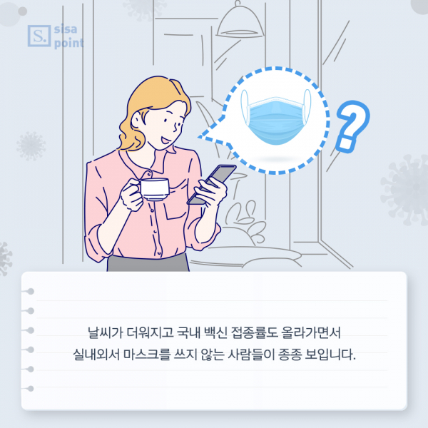 1. 날씨가 더워지고 국내 백신 접종률도 올라가면서 실내외서 마스크를 쓰지 않는 사람들이 종종 보입니다.