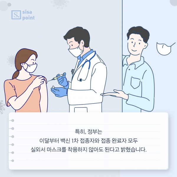 2. 특히, 정부는 이달부터 백신 1차 접종자와 접종 완료자 모두 실외서 마스크를 착용하지 않아도 된다고 밝혔습니다.
