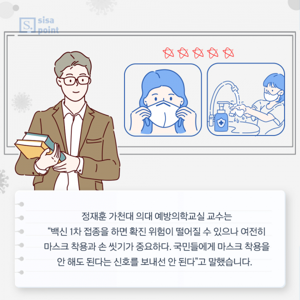 4. 정재훈 가천대 의대 예방의학교실 교수는 “백신 1차 접종을 하면 확진 위험이 떨어질 수 있으나 여전히 마스크 착용과 손 씻기가 중요하다. 국민들에게 마스크 착용을 안 해도 된다는 신호를 보내선 안 된다”고 말했습니다.