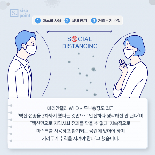 5. 마리안젤라 WHO 사무부총장도 최근 “백신 접종을 2차까지 했다는 것만으로 안전하다 생각해선 안 된다”며 “백신만으로 지역사회 전파를 막을 수 없다. 지속적으로 마스크를 사용하고 환기되는 공간에 있어야 하며 거리두기 수칙을 지켜야 한다”고 했습니다.