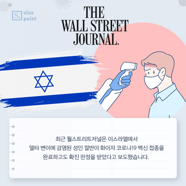 6. 최근 월스트리트저널은 이스라엘에서 델타 변이에 감염된 성인 절반이 화이자 코로나19 백신 접종을 완료하고도 확진 판정을 받았다고 보도했습니다.