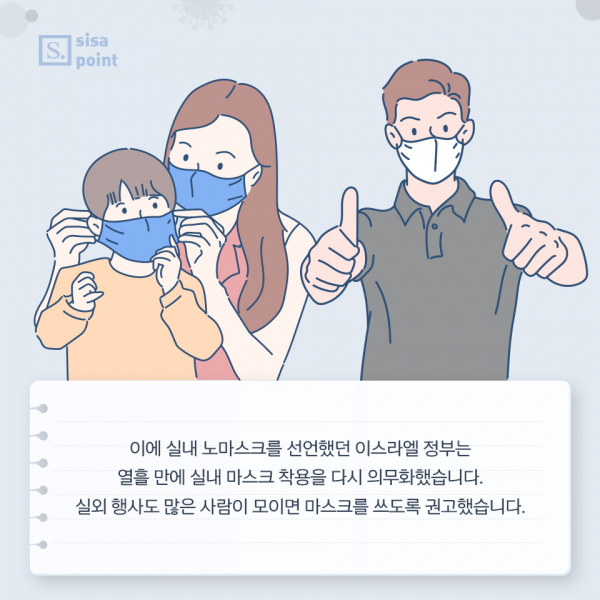 7. 이에 실내 노마스크를 선언했던 이스라엘 정부는 열흘 만에 실내 마스크 착용을 다시 의무화했습니다. 실외 행사도 많은 사람이 모이면 마스크를 쓰도록 권고했습니다.