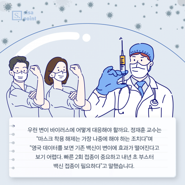 9. 우린 변이 바이러스에 어떻게 대응해야 할까요. 정재훈 교수는 “마스크 착용 해제는 가장 나중에 해야 하는 조치다”며 “영국 데이터를 보면 기존 백신이 변이에 효과가 떨어진다고 보기 어렵다. 빠른 2회 접종이 중요하고 내년 초 부스터 백신 접종이 필요하다”고 말했습니다.