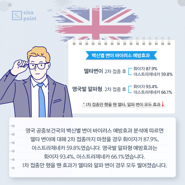 10. 영국 공중보건국의 백신별 변이 바이러스 예방효과 분석에 따르면 델타 변이에 대해 2차 접종까지 마쳤을 경우 화이자가 87.9%, 아스트라제네카 59.8%였습니다. 영국발 알파형 예방효과는 화이자 93.4%, 아스트라제네카 66.1%였습니다. 1차 접종만 했을 땐 효과가 델타와 알파 변이 경우 모두 떨어졌습니다.