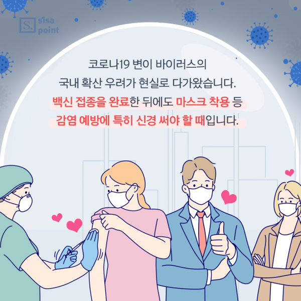 코로나19 변이 바이러스의 국내 확산 우려가 현실로 다가왔습니다. 백신 접종을 완료한 뒤에도 마스크 착용 등 감염 예방에 특히 신경 써야 할 때입니다.
