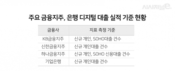 하지만 이는 전체 가계대출에 해당하는 비율로, 기업대출은 포함되지 않는다. 이에 대한 설명 없이 디지털 실적을 공개하면 오해를 살 가능성이 있다. KB금융이 공개한 디지털 대출 실적은 전체 개인의 대출건수 중 비대면 거래 실적으로 2020년 신규계좌수 기준이다.