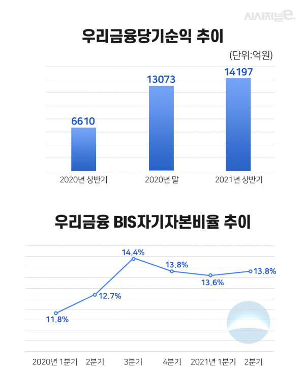 22일 금융권에 따르면 우리금융의 올해 상반기 당기순익(연결·지배지분 기준)은 1조4197억원으로 지난해 같은 기간과 비교해 두 배 넘게 늘었다. 지주 설립 후 반기 기준 최대 실적이다. 작년 전체 순익(1조3073억원)도 넘어섰다.