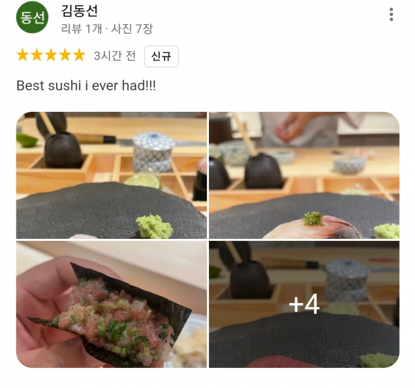 이 일식당은 점심과 저녁, 100% 예약제로 운영된다. 가격은 15만원~20만원 수준이며, 좌석은 8석이다. 주말은 8월 둘째 주까지 예약이 불가능한 상태다. 네이버나 다음 리뷰는 없지만, 구글엔 ‘Best sushi I ever had’(내 인생 최고의 스시다) 라는 리뷰가 존재한다. 작성자 아이디는 ‘김동선’이다.