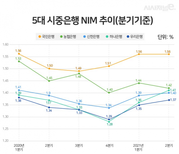 29일 금융권에 따르면 KB국민은행의 2분기 NIM(분기기준)은 1.56%로 직전 분기와 같았다. NH농협은행의 NIM은 같은 기간 0.02%포인트 하락한 1.44%를 기록했다. 나머지 시중은행도 하나은행을 빼놓고는 소폭 오르는데 그쳤다. 신한은행(1.40%), 우리은행(1.44%)는 각각 0.01%포인트, 0.02%포인트 상승했다. 반면 하나은행은 같은 기간 0.05%포인트 급등한 1.41%를 기록했다.