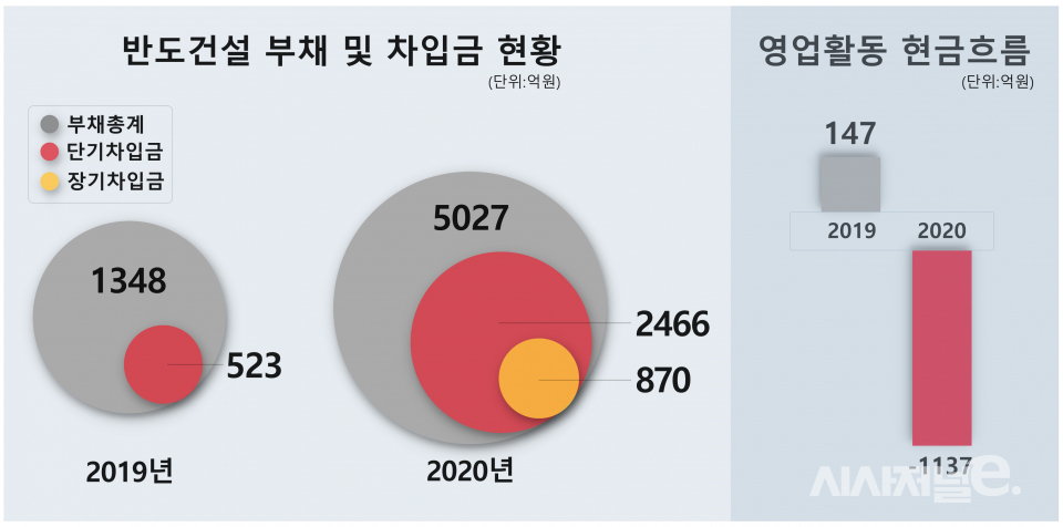 수익성이 악화되면서 현금흐름도 나빠졌다. 지난해 반도건설의 ‘영업활동으로부터 창출된 현금흐름’은 마이너스(-) 1137억원를 기록했다. 전년도에 147억원을 기록한 것과 비교하면 1년 새 약 1000억원 가량 간극이 벌어진 셈이다. 반도건설의 영업활동 현금흐름이 마이너스 지표를 기록했던 것은 지난 2015년 결산 이후 5년 만이다.