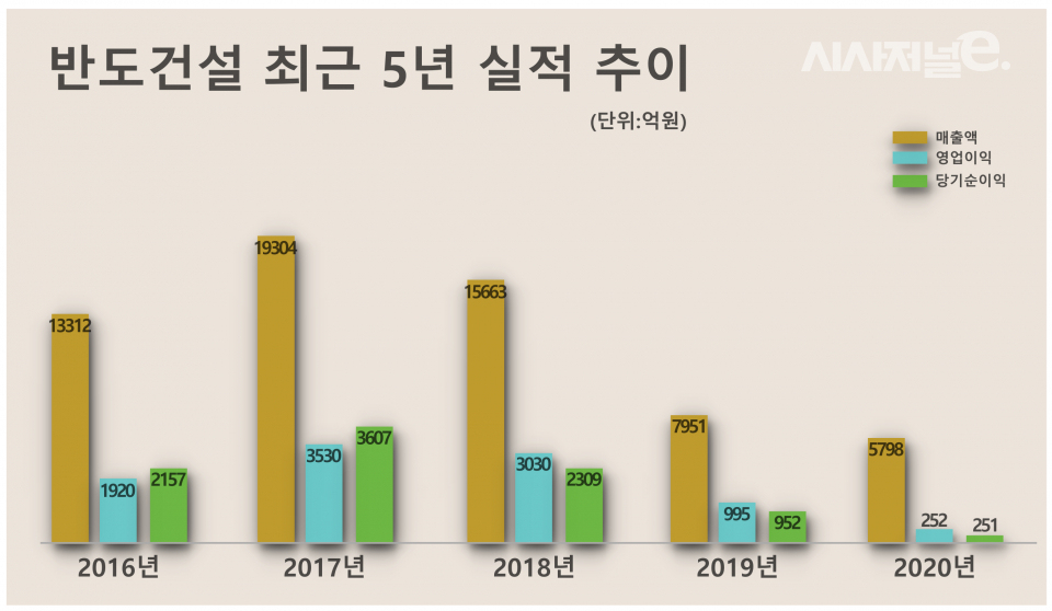 부진한 실적도 시공능력평가 순위를 끌어내렸다. 반도건설은 2017년을 정점으로 실적이 내리막길을 걷고 있다. 연간 매출액은 2017년 1조9803억원, 2018년 1억5662만원, 2019년 9751억원으로, 2020년 5798억원으로 4년 연속 감소했다. 영업이익은 지난해 252억원을 기록하며 4년 새 3000억원 이상 쪼그라들었다. 당기순이익도 700억원 가까이 줄었다.