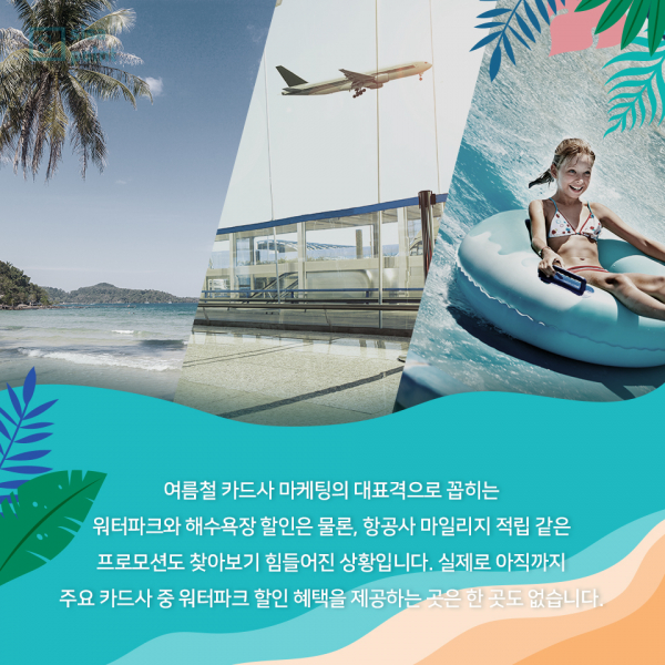여름철 카드사 마케팅의 대표격으로 꼽히는 워터파크와 해수욕장 할인은 물론, 항공사 마일리지 적립 같은 프로모션도 찾아보기 힘들어진 상황입니다. 실제로 아직까지 주요 카드사 중 워터파크 할인 혜택을 제공하는 곳은 한 곳도 없습니다.