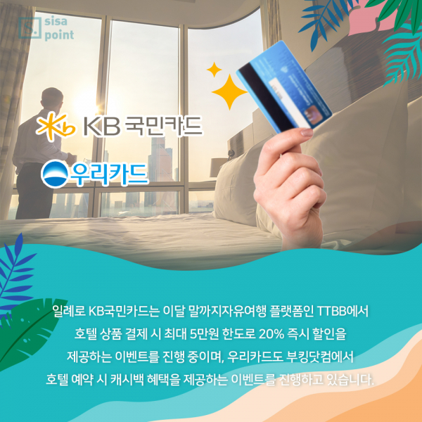 일례로 KB국민카드는 이달 말까지자유여행 플랫폼인 TTBB에서 호텔 상품 결제 시 최대 5만원 한도로 20% 즉시 할인을 제공하는 이벤트를 진행 중이며, 우리카드도 부킹닷컴에서 호텔 예약 시 캐시백 혜택을 제공하는 이벤트를 진행하고 있습니다.