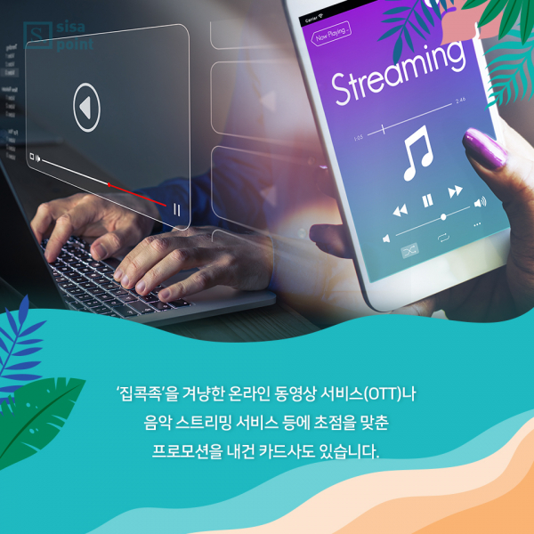 ‘집콕족’을 겨냥한 온라인 동영상 서비스(OTT)나 음악 스트리밍 서비스 등에 초점을 맞춘 프로모션을 내건 카드사도 있습니다.