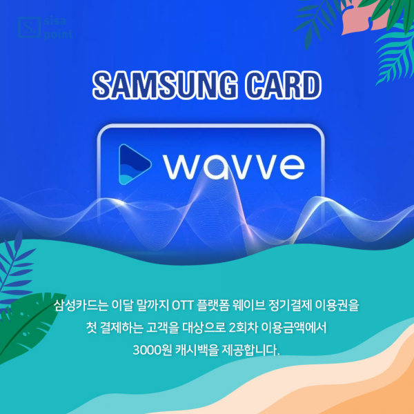 삼성카드는 이달 말까지 OTT 플랫폼 웨이브 정기결제 이용권을 첫 결제하는 고객을 대상으로 2회차 이용금액에서 3000원 캐시백을 제공합니다.