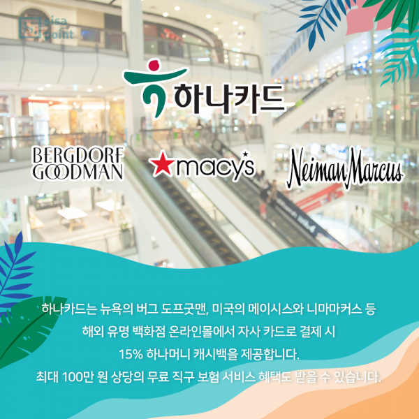 하나카드는 뉴욕의 버그 도프굿맨, 미국의 메이시스와 니마마커스 등 해외 유명 백화점 온라인몰에서 자사 카드로 결제 시 15% 하나머니 캐시백을 제공합니다. 최대 100만 원 상당의 무료 직구 보험 서비스 혜택도 받을 수 있습니다.
