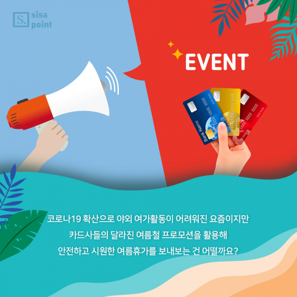 코로나19 확산으로 야외 여가활동이 어려워진 요즘이지만 카드사들의 달라진 여름철 프로모션을 활용해 안전하고 시원한 여름휴가를 보내보는 건 어떨까요?