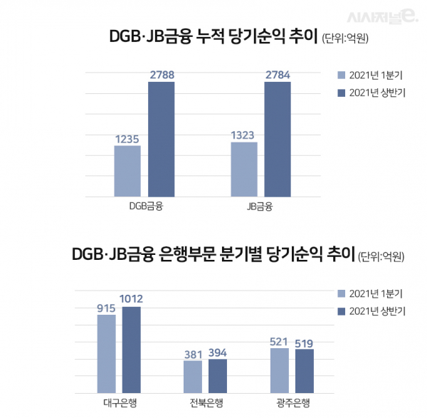 하지만 은행에서는 희비가 다소 엇갈렸다. 대구은행의 2분기 당기순익은 직전분기 대비 10.6% 급증했다. 이에 대구은행의 상반기 순익은 1927억원으로 전년 동기 대비 44.6% 급증했다. 반면, 광주은행은 직전 분기 대비 순익이 1.1% 소폭 줄었다. 최근 은행권의 실적 증대와 다른 행보다. 이에 전북은행과 합한 JB금융의 은행부문 이익은 1812억원으로 대구은행에 100억원 정도 뒤졌다.