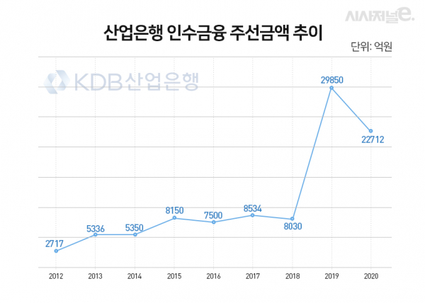 산은은 산금채를 무기로 인수금융 시장에 2%대 금리의 대출을 제공했다. 3~4%대인 민간 금융사들이 따라갈 수 없는 수준이라는 것이 금융권의 시각이다. 산은은 금리 경쟁력을 바탕으로 이자이익과 수수료이익을 늘렸다. 산은이 지난해 인수금융 주선으로 거둔 수수료이익은 270억원으로 2018년 대비 12배 넘게 급증했다.