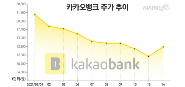 14일 금융권에 따르면 카카오뱅크의 이날 주가는 6만9700원으로 전일 대비 7.89% 올랐다. 그간 8거래일간 연속 하락하는 등 내림세 끝에 가까스로 반등했다. 카카오뱅크의 주가는 최근 상장 후 가장 큰 낙폭을 기록했다. 8거래일 연속 하락한 기간에 하락률은 27%였다. 4대 금융지주(KB·신한·하나·우리)는 같은 기간 2.4~2.7% 내리는데 그쳤다.