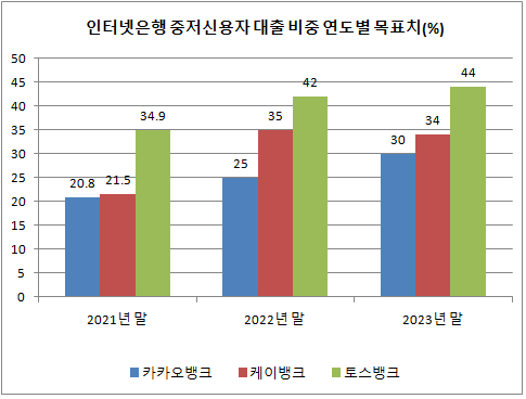 하지만 중·저신용자 대출 비중을 올해 말 34%로 끌어올려야 하는 점은 부담이다. 토스뱅크는 시작부터 인터넷은행 가운데 가장 높은 비율을 달성해야 하는 셈이다. 카카오뱅크와 케이뱅크는 올해 말까지 중저신용자 대출 비중 목표치는 각각 20.8%, 21.5%다. 토스뱅크의 사업계획에서 따르면 올해 말 전체 신용대출 목표액은 4693억원이고, 이 중 중저신용자 대출은 1636억원이 돼야 한다.