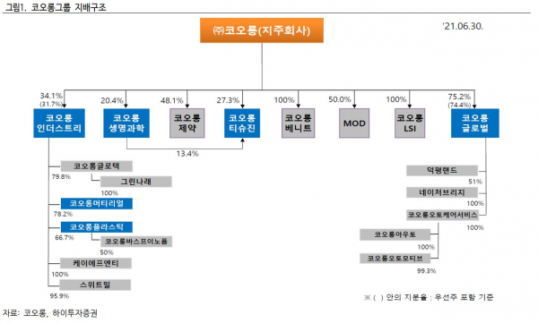 코오롱그룹은 지주사 코오롱을 비롯해 코오롱인더스트리, 코오롱플라스틱, 코오롱머티리얼, 코오롱글로벌, 코오롱생명과학, 코오롱티슈진의 상장사를 거느리고 있다. 이 가운데 코오롱인더스트리와 코오롱플라스틱, 코오롱글로벌 등은 수소경제 합류를 위한 사업확장에 나서면서 수소 수혜주로 부각되고 있다.