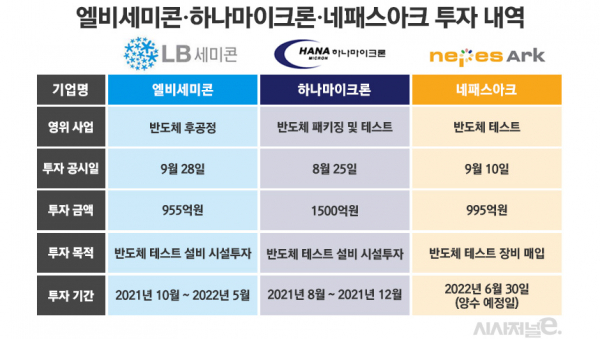 반도체 패키징 및 테스트 전문기업인 하나마이크론과 반도체 후공정 업체 네패스의 자회사 네패스아크도 증설에 나섰다. 하나마이크론은 지난달 25일 비메모리 테스트 신규시설에 1500억원, 네패스아크는 지난 10일 반도체 테스트 장비 투자에 995억원을 투자한다고 각각 공시했다.