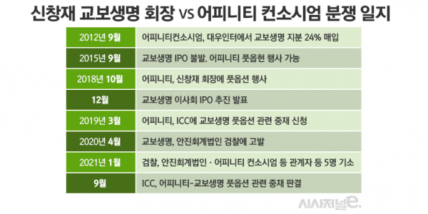 교보생명과 어피니티 컨소시엄(어피니티에쿼티 파트너스, IMM PE, 베어링 PE, 싱가포르투자청)은 풋옵션 행사를 두고 법적 분쟁을 벌이고 있다. 어피니티 측이 지난 2012년에 사들인 교보생명 주식 24%에 대한 풋옵션을 주당 40만9000원에 행사하려고 하자 신창재 교보생명 회장은 터무니 없이 높은 가격이라며 이를 거부했기 때문이다.