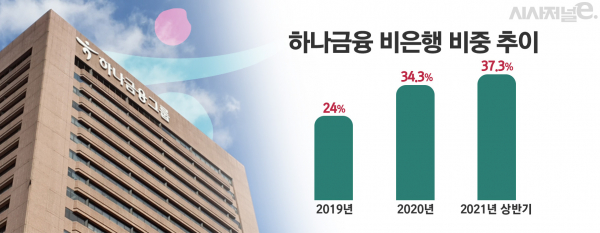 하나금융은 지난해에 이어 올해 상반기까지 비은행 부문의 성장이 두드러졌다. 작년 전체 순익 가운데 비은행 계열사 비중은 34.3%로 작년 대비 10%포인트 넘게 올랐다. 올해 상반기에는 더 늘어 37.3%를 기록했다. 하나금투가 증시 호황을 타고 실적이 급증했기 때문이다. 일각에선 하나금융의 비은행 비중은 연내 40%를 넘길 것이란 예상도 나왔다.