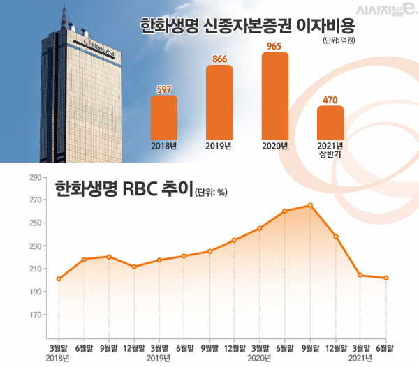 [시사저널e=유길연 기자] 한화생명이 새 회계기준 도입에 대응하기 위해 추가 자본확충을 검토하는 것으로 알려지면서 이자비용 부담 증대에 대한 우려가 제기된다. 한화생명은 자본건전성을 개선하기 위해 신종자본증권을 대규모로 발행한 탓에 매년 1000억원 가량의 이자를 지불하고 있기 때문이다.