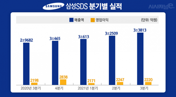 [시사저널e=이하은 기자] 삼성SDS IT서비스와 물류 사업이 모두 성장하며 3분기 매출은 1·2분기에 이어 3조원대를 기록했다. 연말 성수기 효과에 따라 물류 부문이 효자 노릇을 톡톡히 했다. 그러나 이익률이 낮은 물류 부문의 성장이 컸던 탓에 영업이익률 성장은 매출 성장률 13.9%에 비해 낮은 1%에 그쳤다.