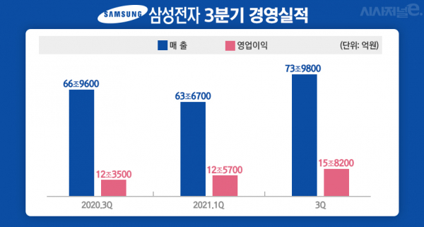 삼성전자는 지난 3분기 연결기준 매출 73조9800조원, 영업이익 15조8200억원을 기록했다고 28일 밝혔다. 역대 최대치였던 전분기 매출(66조9600억원)보다 10.5% 증가했다. 영업이익은 전 분기(12조3500억원)보다 28% 상승했고, 지난 2018년 3분기에 이어 두 번째로 높은 수치를 보였다.