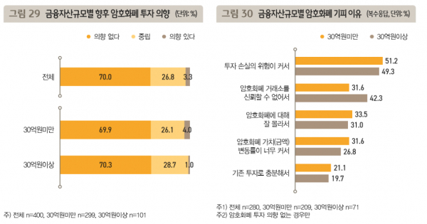 연구진은 “부자들은 대체로 보유한 자산을 적극적으로 운용해 수익을 추구하는 방식을 선호한다”며 “암호화폐는 위험률이 감당할 수 있는 범위를 넘어서고, 거래 자체의 신뢰성에 의문이 제기되기 때문에 투자처로 매력을 느끼지 못하는 것으로 분석된다”고 설명했다.