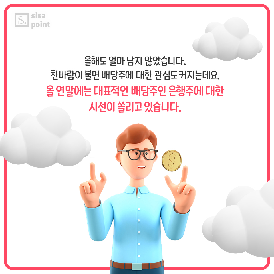 1. 올해도 얼마 남지 않았습니다. 찬바람이 불면 배당주에 대한 관심도 커지는데요. 올 연말에는 대표적인 배당주인 은행주에 대한 시선이 쏠리고 있습니다.
