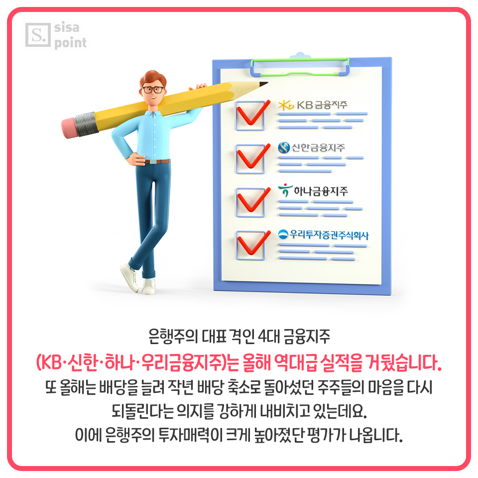 2. 은행주의 대표 격인 4대 금융지주(KB·신한·하나·우리금융지주)는 올해 역대급 실적을 거뒀습니다. 또 올해는 배당을 늘려 작년 배당 축소로 돌아섰던 주주들의 마음을 다시 되돌린다는 의지를 강하게 내비치고 있는데요. 이에 은행주의 투자매력이 크게 높아졌단 평가가 나옵니다.
