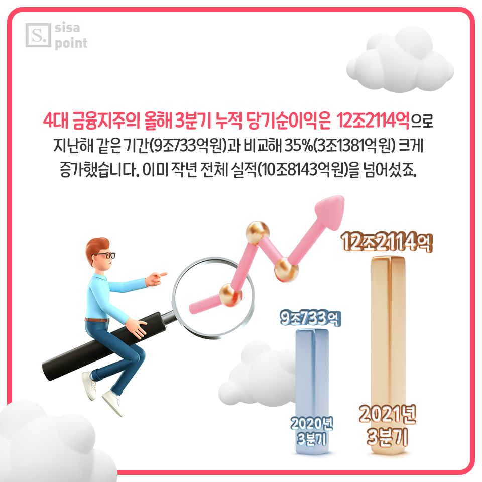3. 4대 금융지주의 올해 3분기 누적 당기순이익은 12조2114억원으로 지난해 같은 기간(9조733억원)과 비교해 35%(3조1381억원) 크게 증가했습니다. 이미 작년 전체 실적(10조8143억원)을 넘어섰죠.