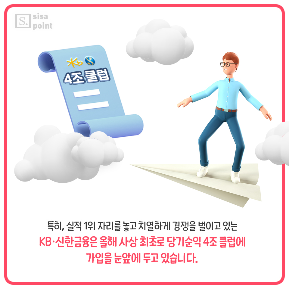 4. 특히, 실적 1위 자리를 놓고 치열하게 경쟁을 벌이고 있는 KB·신한금융은 올해 사상 최초로 당기순익 4조 클럽에 가입을 눈앞에 두고 있습니다.