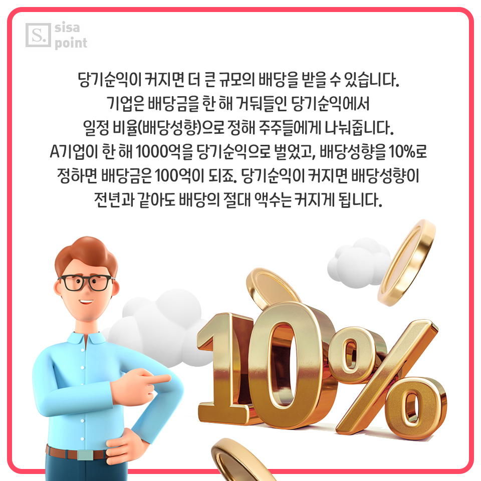6. 당기순익이 커지면 더 큰 규모의 배당을 받을 수 있습니다. 기업은 배당금을 한 해 거둬들인 당기순익에서 일정 비율(배당성향)으로 정해 주주들에게 나눠줍니다. A기업이 한 해 1000억을 당기순익으로 벌었고, 배당성향을 10%로 정하면 배당금은 100억이 되죠. 당기순익이 커지면 배당성향이 전년과 같아도 배당의 절대 액수는 커지게 됩니다.