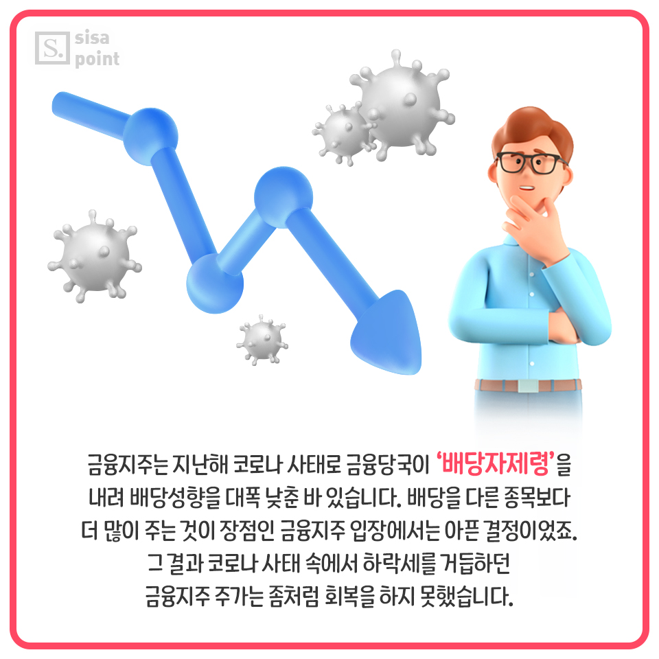 8. 금융지주는 지난해 코로나 사태로 금융당국이 ‘배당자제령’을 내려 배당성향을 대폭 낮춘 바 있습니다. 배당을 다른 종목보다 더 많이 주는 것이 장점인 금융지주 입장에서는 아픈 결정이었죠. 그 결과 코로나 사태 속에서 하락세를 거듭하던 금융지주 주가는 좀처럼 회복을 하지 못했습니다.