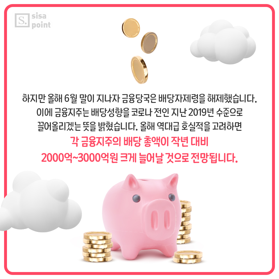 9. 하지만 올해 6월 말이 지나자 금융당국은 배당자제령을 해제했습니다. 이에 금융지주는 배당성향을 코로나 전인 지난 2019년 수준으로 끌어올리겠는 뜻을 밝혔습니다. 올해 역대급 호실적을 고려하면 각 금융지주의 배당 총액이 작년 대비 2000억~3000억원 크게 늘어날 것으로 전망됩니다.