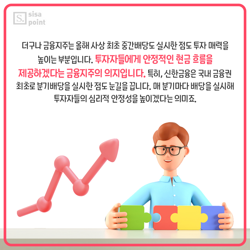 10. 더구나 금융지주는 올해 사상 최초 중간배당도 실시한 점도 투자 매력을 높이는 부분입니다. 투자자들에게 안정적인 현금 흐름을 제공하겠다는 금융지주의 의지입니다. 특히, 신한금융은 국내 금융권 최초로 분기배당을 실시한 점도 눈길을 끕니다. 매 분기마다 배당을 실시해 투자자들의 심리적 안정성을 높이겠다는 의미죠.