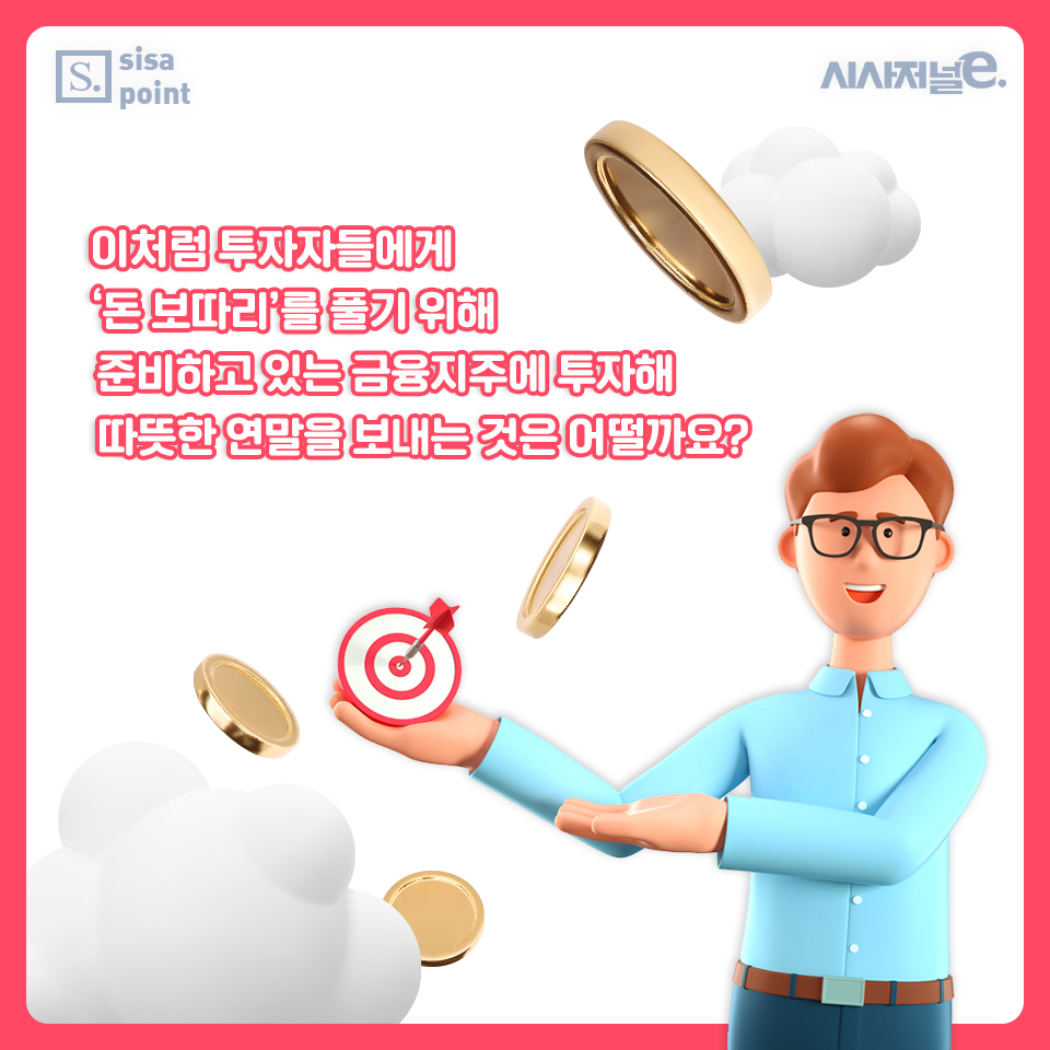 11. 이처럼 투자자들에게 ‘돈 보따리’를 풀기 위해 준비하고 있는 금융지주에 투자해 따뜻한 연말을 보내는 것은 어떨까요?