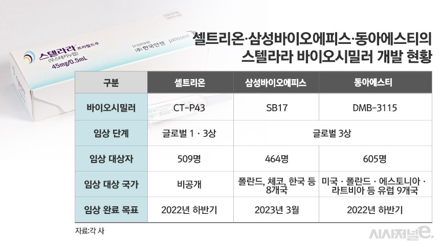 [시사저널e=염현아 기자] 국내 대표 바이오 기업들이 대형 바이오의약품 ‘스텔라라’의 바이오시밀러 개발에 박차를 가하고 있다. 현재 글로벌 임상 3상을 진행 중인 셀트리온 삼성바이오에피스, 동아에스티는 스텔라라의 특허 만료 시점에 맞춰 임상을 완료한다는 계획이다. 전 세계 매출 8조원에 달하는 블록버스터 제품의 첫 시밀러인 만큼 관심이 집중된다.