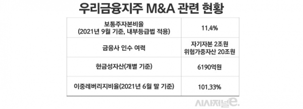우리금융의 재무적 상황을 고려하면 보험사 인수가 유리하다는 해석이 나온다. 금융지주는 금융사 인수를 할 때 건전성 지표인 국제결제은행(BIS)자기자본비율을 고려해야 한다. 금융사를 인수하면 BIS비율 하락해 최대한 자본 여력을 확보해야 한다. 우리금융은 현재 BIS비율의 한 지표인 보통주자본비율 여력이 크지 않아 더욱 세심한 자본비율 관리가 필요하다.