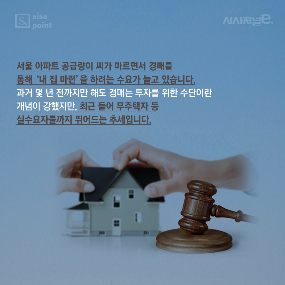 1. 서울 아파트 공급량이 씨가 마르면서 경매를 통해 ‘내 집 마련’을 하려는 수요가 늘고 있습니다. 과거 몇 년 전까지만 해도 경매는 투자를 위한 수단이란 개념이 강했지만, 최근 들어 무주택자 등 실수요자들까지 뛰어드는 추세입니다.
