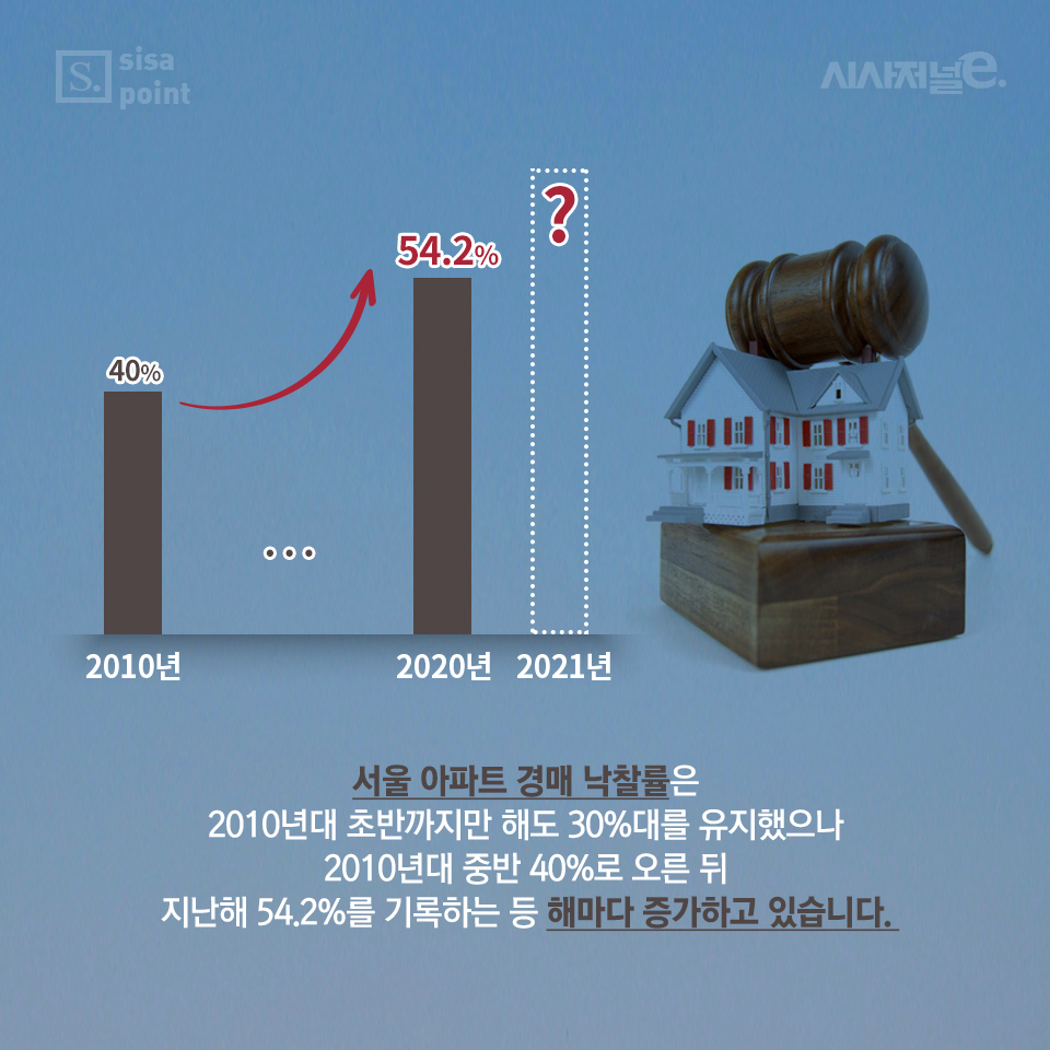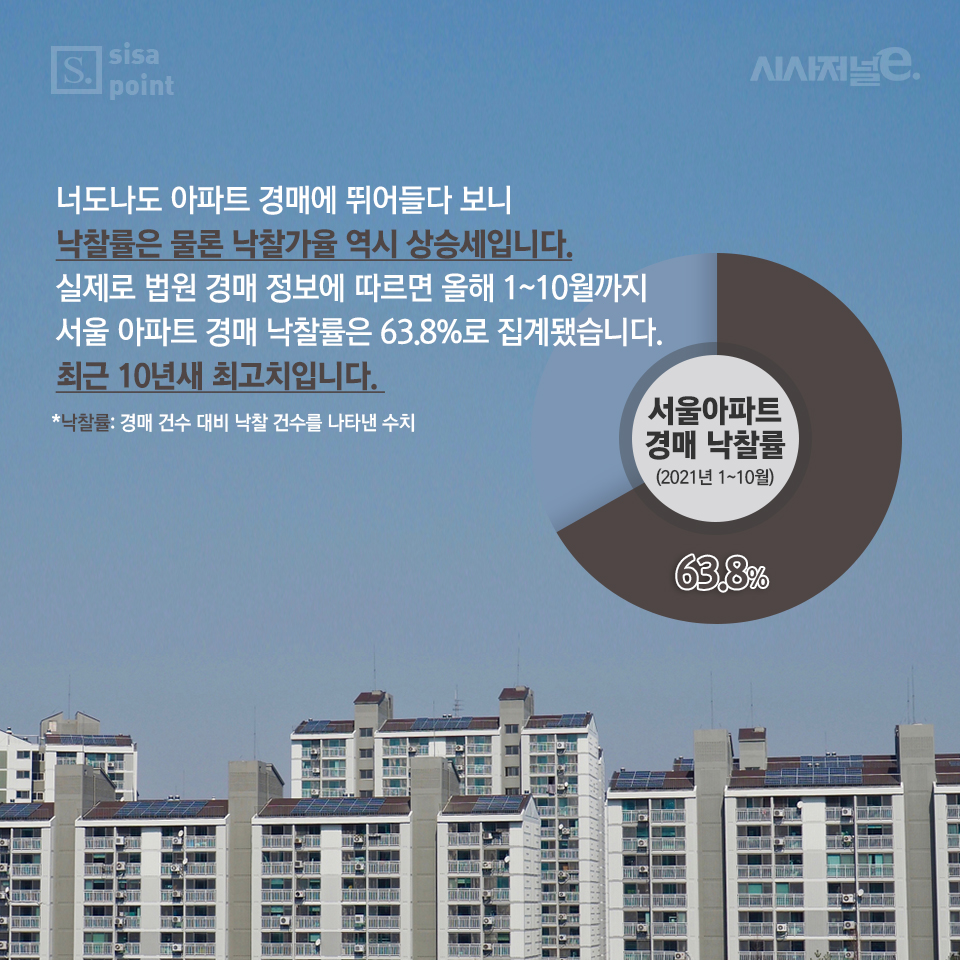 2. 너도나도 아파트 경매에 뛰어들다 보니 낙찰률은 물론 낙찰가율 역시 상승세입니다. 실제로 법원 경매 정보에 따르면 올해 1~10월까지 서울 아파트 경매 낙찰률은 63.8%로 집계됐습니다. 최근 10년새 최고치입니다.